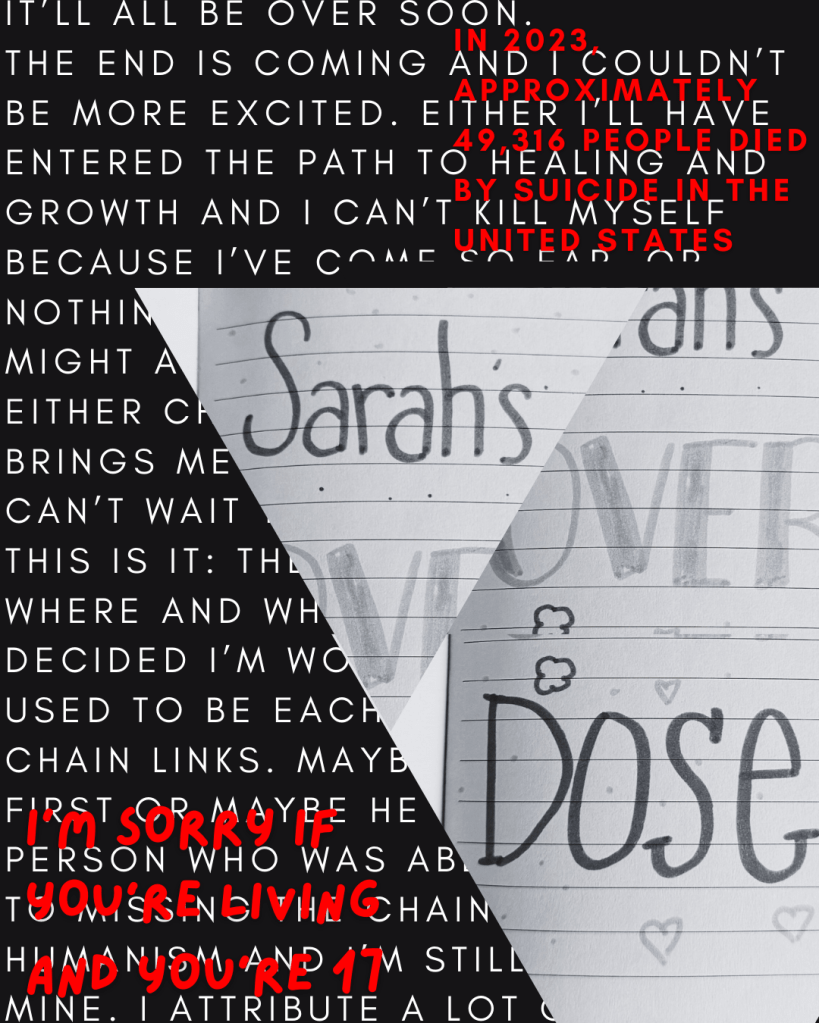The first slide features a triangular black and white collage that consists of photos of the front page of a journal labelled “Sarah’s Over Dose”. Behind the triangle is layered text that appear to be from another journal in a Sans-Serif font in a white, unicase style. The text is white and the background is back. Over the text, there are two overlays. There are two fonts: a handwriting-esque font (Lazydog) and a Sans-Serif font (Glacial Indifference) in a bright red colour. The text in the upper-right corner is a statistic about deaths by suicide and the text in the bottom-left corner is a quote from The 1975’s song, “The 1975“, which additionally acknowledges the age of the patient.